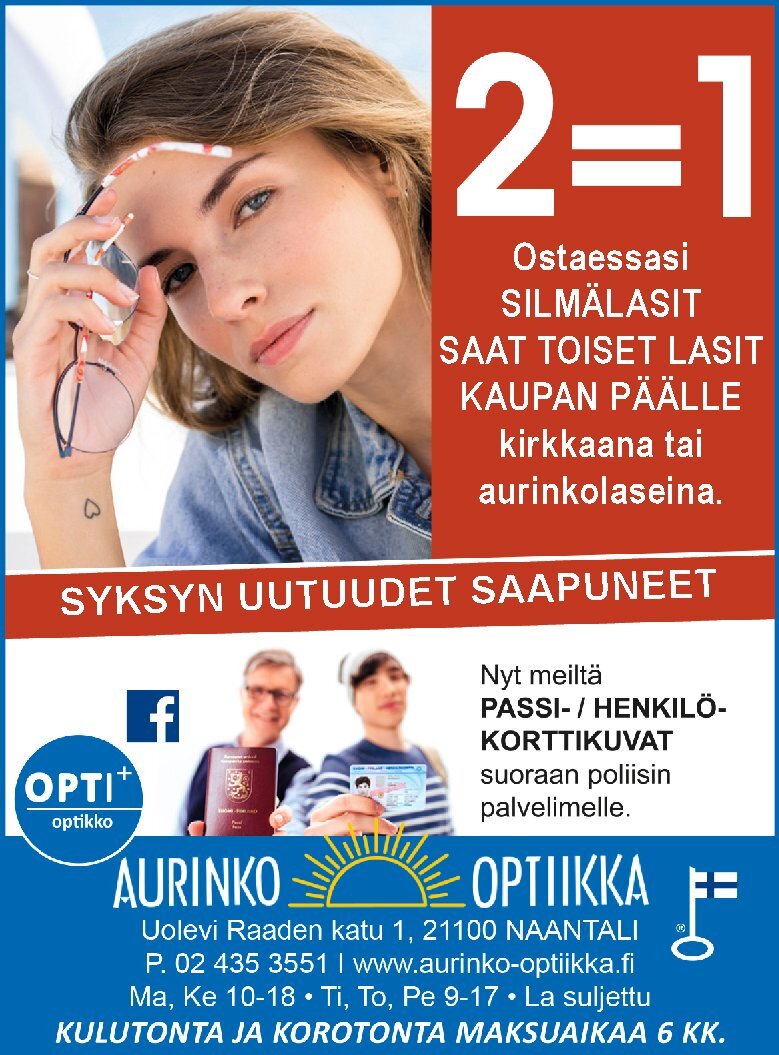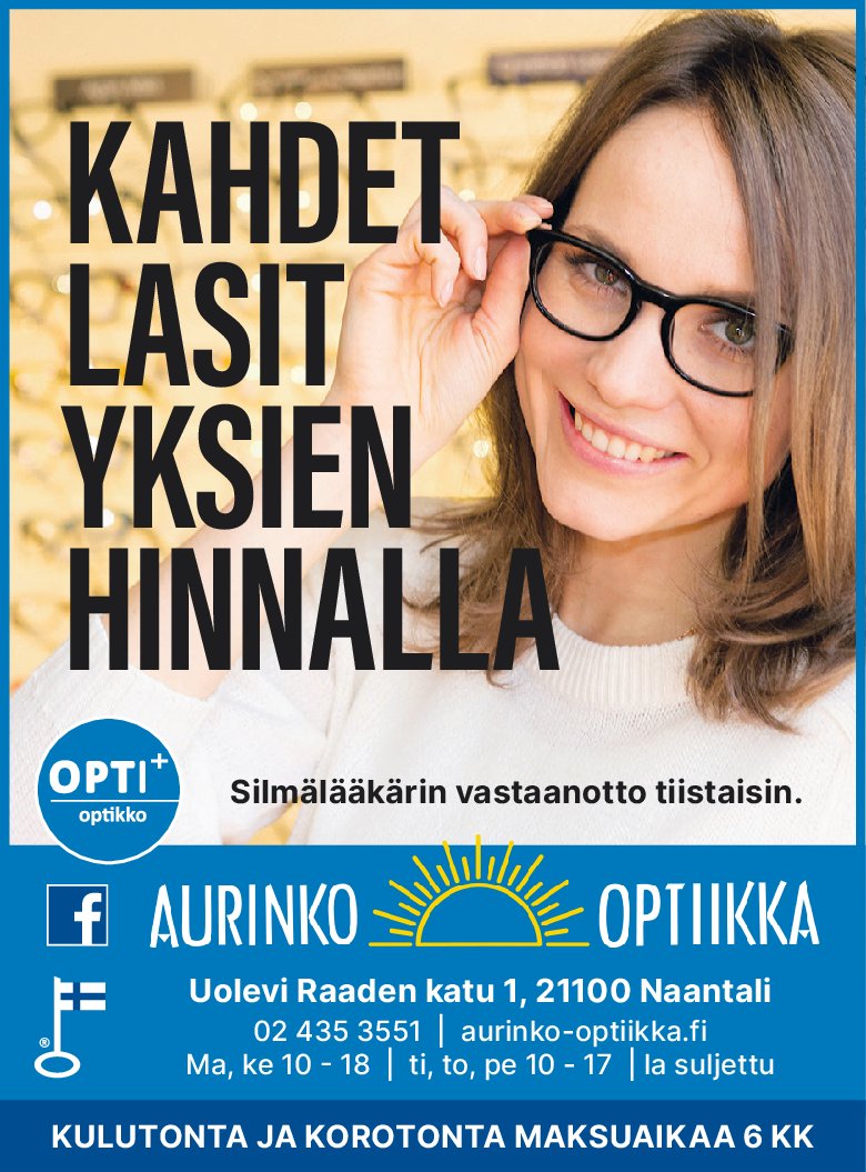 Aurinko-Optiikka on yksityinen Opti+ optikoihin kuuluva optikkoliike. Meiltä saat hyvää palvelua ja taatusti laadukkaat silmälasit.